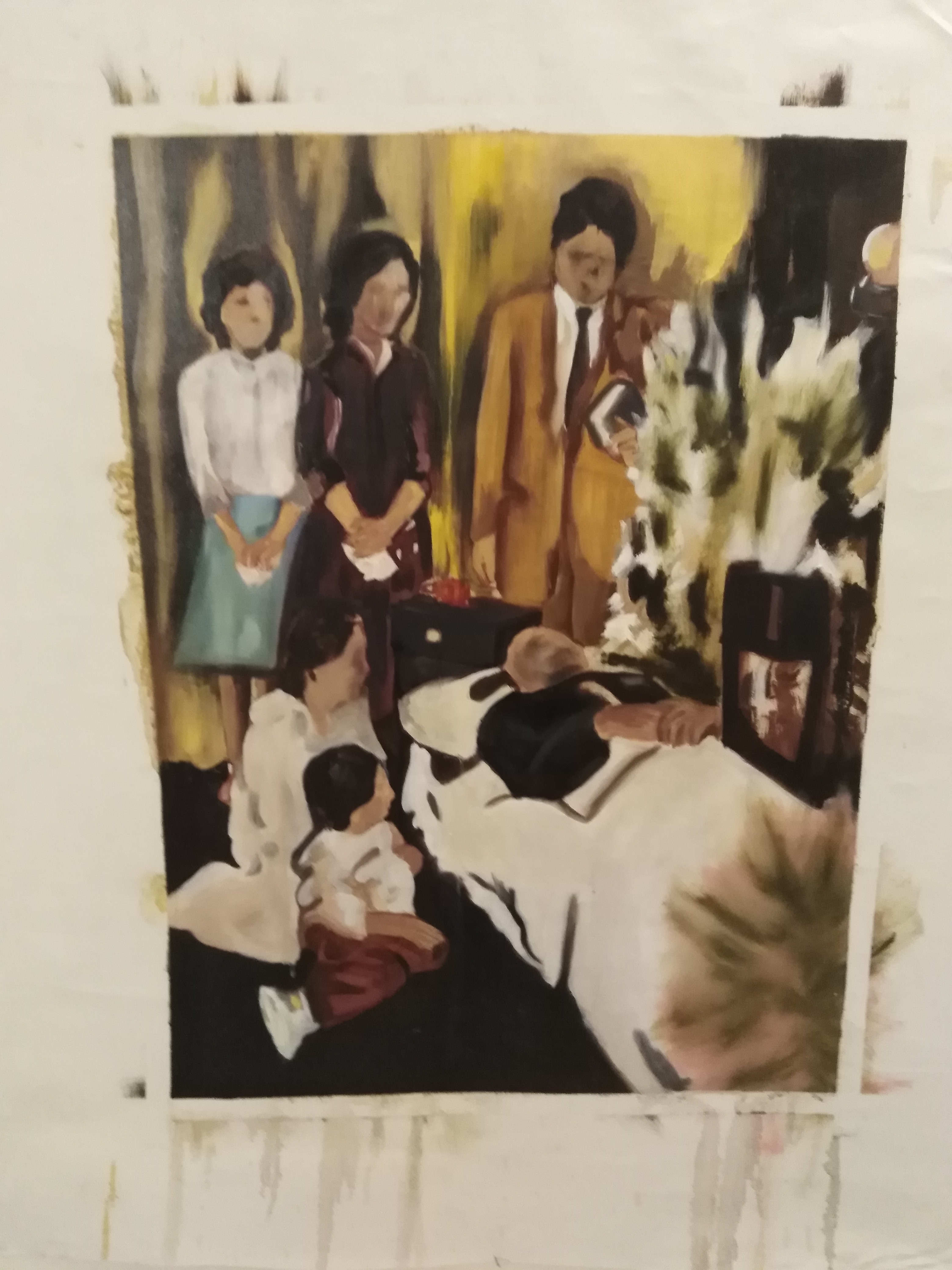 I was reading one of artist Christian Boltanski’s interviews recently and he mentioned how the faces he uses in his work are hardly ever of people he knows, which proves that familiarity can never be an excuse between ’empathy and indifference’. I overheard Naira telling one of the visitors that the reference photographs she uses for her work are whisked from unknown sources. I remember once she found a small family album claded with photographs of a family from the west while digging into ‘curious – materiality’ in the ‘Landa Bazar’ (local thrift market, rejected, used, imported products, clothes etc from the first world)