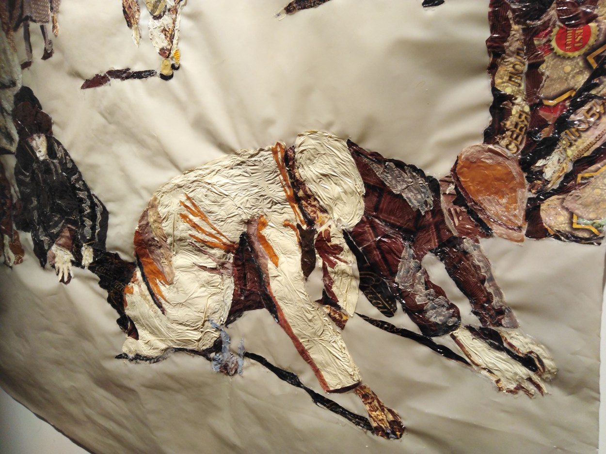 Suleimenova’s Work has a ‘Third of May’ Goya streak. It presents a Goya-ish effect in a Popular or Dadaist way. Material is meaning, here. Plastic bags offer a luminosity of sorts and radiate a transparency. They are skin cells – they are Anselm Keifer’s memory rampage and they are reptiles of everyday-ness. Collage is paint, the figures walk and act in bodies that wear war, loss and courage with words and ideas that are wasted and thrown away, all the time…